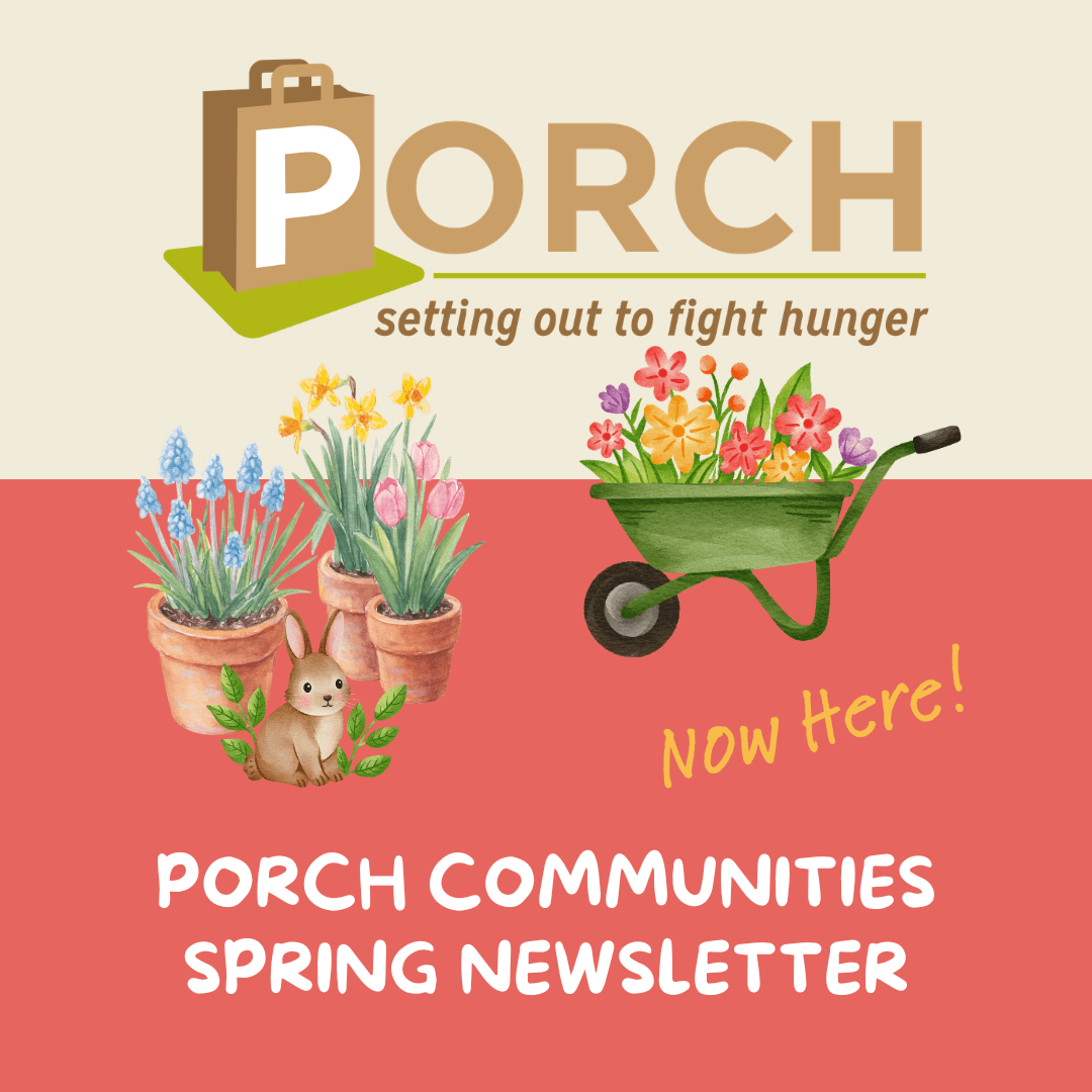 PORCH Communities is a grassroots nonprofit uniting neighbors to fight hunger. Through our simple model, thousands of volunteers collect food from porches each month, creating a reliable supply for local pantries.